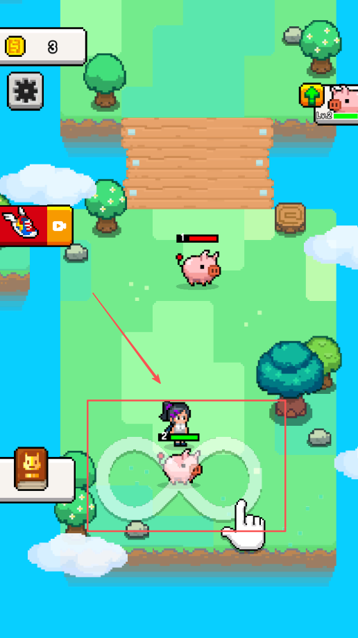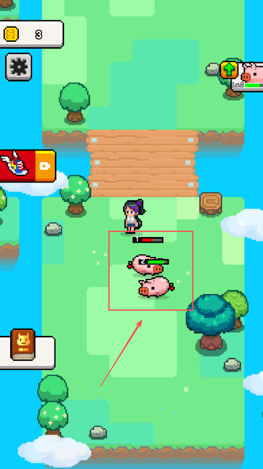 2、控制小人移动时,把跟随的小猪带到怪兽所在的位置,只要小猪靠近怪兽,就能自动触发战斗,开始打怪。