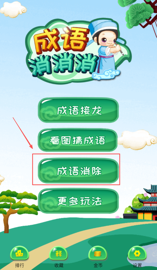 1、打开成语消消消,等加载完成进入主界面,在界面上找到成语接龙按钮,点击后开启成语文字游戏挑战。