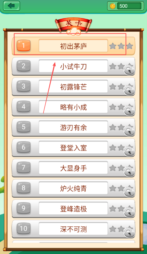 2、进入挑战界面后,选择第一关卡,要是之前玩过并获得三星,直接点击已完成的三星关卡就能再次进入游玩。