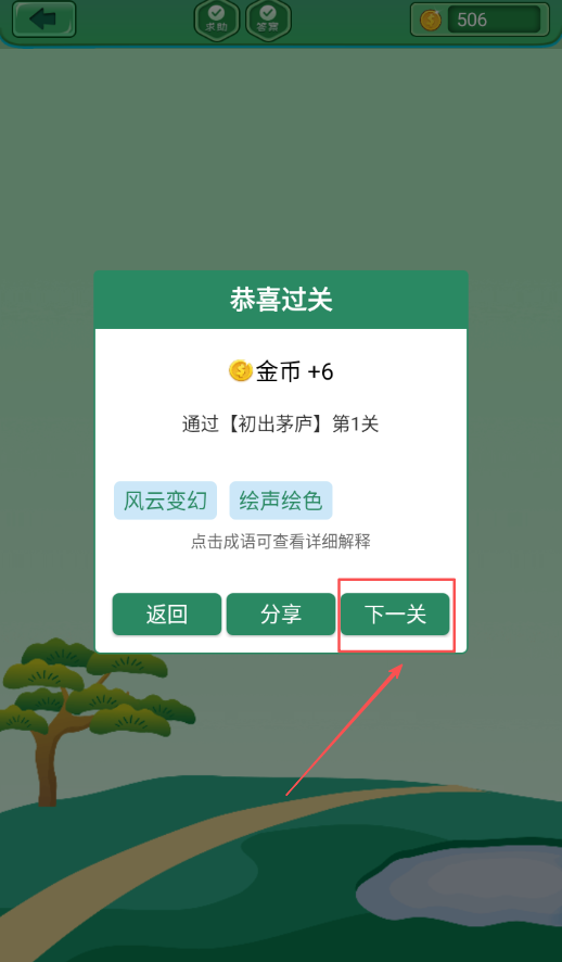 4、填完空格组成正确成语后,按规则完成消除,继续找出关卡内其他成语,全部完成就能通关,还能查看成语解释。
