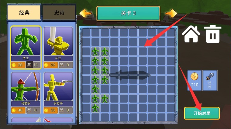 2、在布阵阶段安排勇士站位组合布局,点击开始对局按钮开启自动战斗过程。