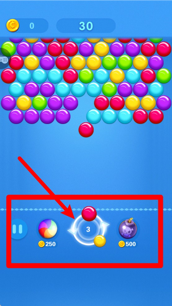 2.道具辅助:多样化的辅助道具在下方展示,包括彩虹球和炸弹球,能帮助玩家顺利消除复杂泡泡布局,增加通关几率。