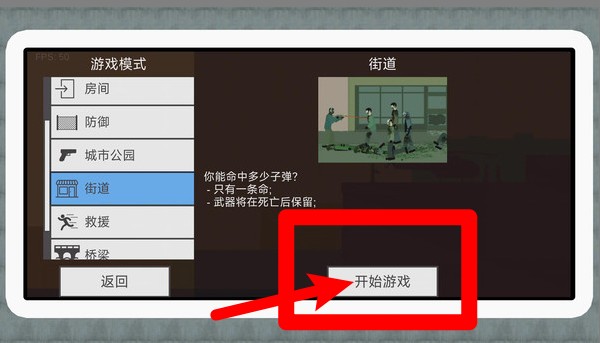 1.模式选择:游戏提供房间、防御、城市公园和街道等多种模式,玩家可自由选择不同场景,点击"开始游戏"体验多样化的僵尸挑战。