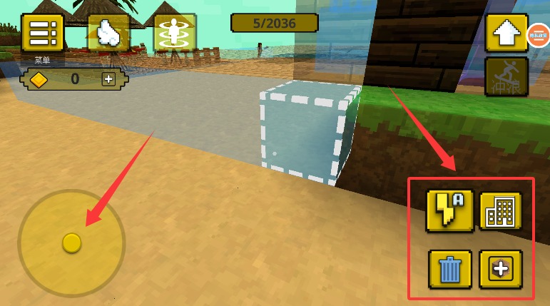 4、通过左侧摇杆控制移动与视角转换,右侧工具栏提供建造删除等操作功能。