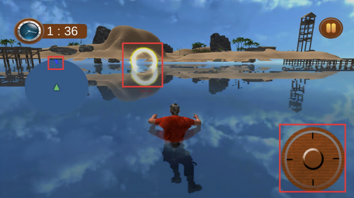 3、进入海上场景后,操控角色朝发光圆环方向游动,利用右侧方向键调整行进路线。