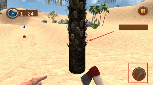 4、登陆岛屿后点击右侧斧头图标,对棕榈树进行砍伐,获取木材等基础生存资源。