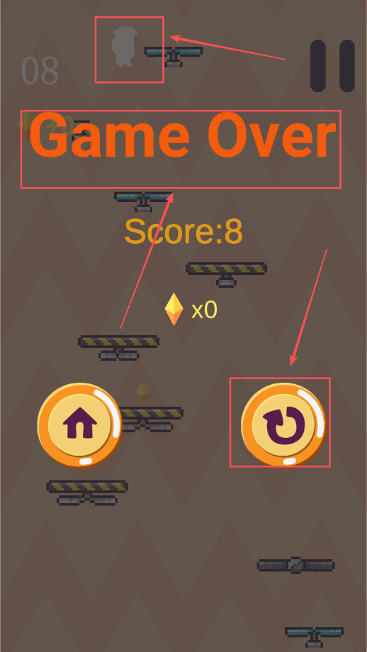 4、要是板子升到顶部还没来得及跳,或者没跳到下面的板子直接掉下去,游戏就会结束,此时点击圆圈箭头就能重新开始。