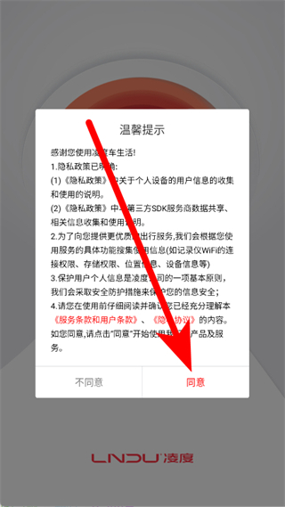 1、打开凌度车生活,在弹窗中点击同意。