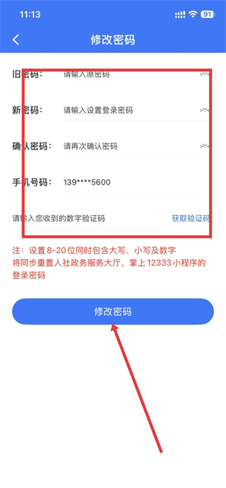 4、根据要求填写信息,点击修改密码,即可完成密码修改。