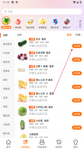 2、在蔬菜水果类商品展示页面,找到想要购买的商品,点击该商品右侧的选规格按钮。