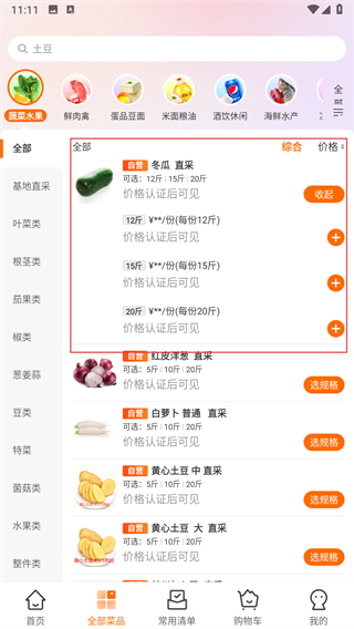 1、打开菜划算APP,在首页点击蔬菜水果分类,进入蔬菜水果类商品展示页面。
