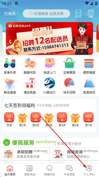 1、打开玩转甘孜,点击底部导航栏个人中心选项。
