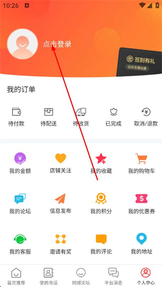 2、在个人中心页面中,找到并点击点击登录区域。
