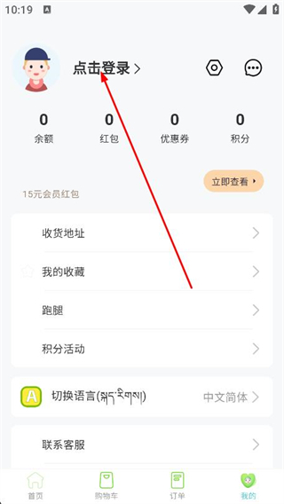 2、在我的页面中,找到并点击上方的点击登录区域。