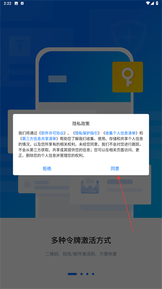 1、打开腾讯身份验证器APP,进入时会弹出隐私政策,点击同意的按钮。