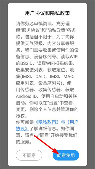 1、在用户协议和隐私政策弹窗中,点击同意使用,进入软件主界面。