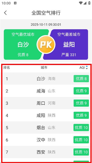 3、在全国空气排行页面,可查看不同城市的空气质量排名等信息。