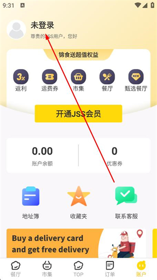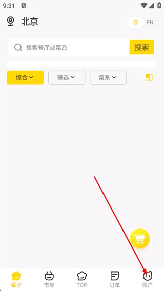 1、打开锦食送app,点击底部导航栏最右侧账户。