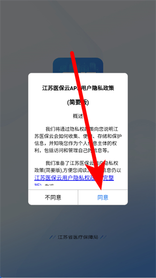 1、打开江苏医保云APP,在用户隐私政策弹窗中点击同意。