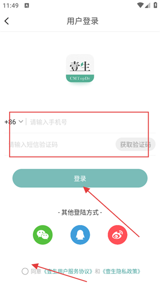 3、输入手机号、验证码,点击登录,勾选同意服务协议和隐私政策,即可完成注册。