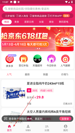 1、打开天天淘APP,点击底部首页,在首页可看到精选、美食等分类,还能通过顶部搜索框查找商品。