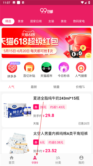 2、点击底部9块9,进入9块9专区,这里有众多低价商品,涵盖不同品类,可在此挑选价格实惠的心仪商品。