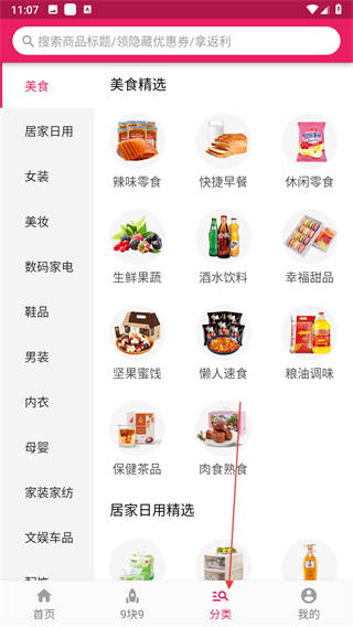 3、点击底部分类,进入分类页面,左侧有美食、居家日用等多个品类选项,右侧对应展示各品类下的精选商品。