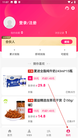 4、点击底部我的,进入个人页面,可进行登录/注册操作,还能查看我的收藏、浏览记录,以及合伙人相关的信息。