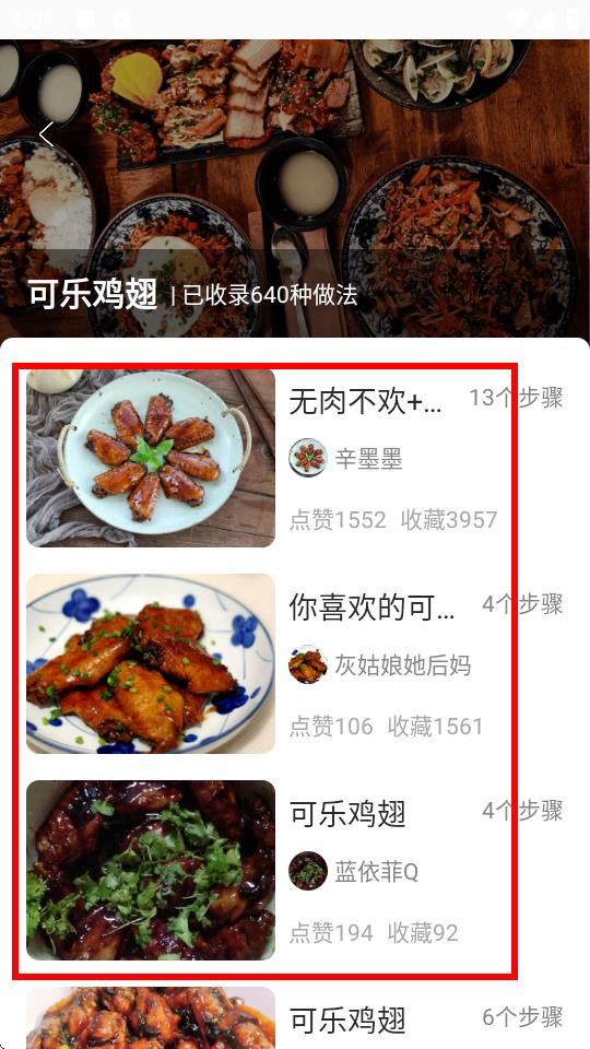3、在菜品页面,浏览众多用户分享的可乐鸡翅做法,选择感兴趣的做法点击进入。