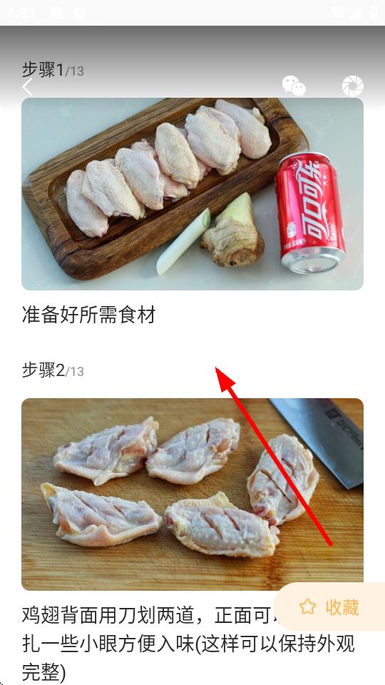 4、进入具体菜谱页面,按步骤准备食材和烹饪,比如先准备鸡翅、可乐等食材。
