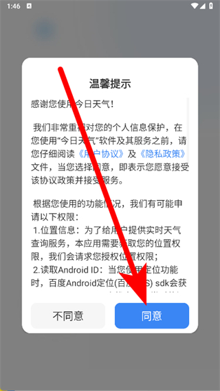 1、打开及时雨天气预报,在弹窗中点击同意。