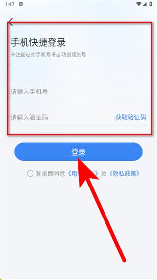 4、输入手机号和验证码,勾选同意协议后,点击登录,完成注册。