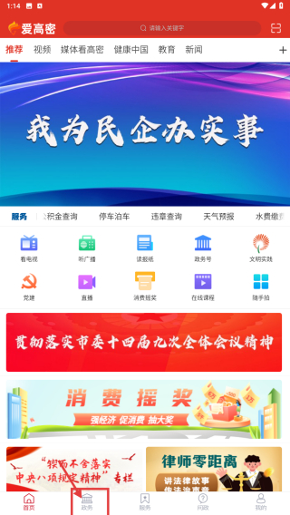 1、打开爱高密应用,点击底部政务选项,进入政务页面。