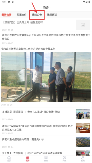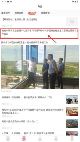 2、在政务页面,点击通知公告栏,进入查看详情。