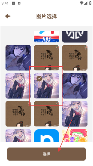 3、在图片选择页面,选中想要的图片后,点击选择,回到照片制作页面。
