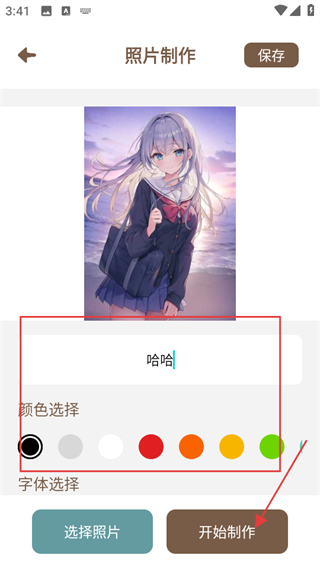 4、在照片制作页面,输入文字,选择颜色,点击开始制作,即可生成带照片的签名。