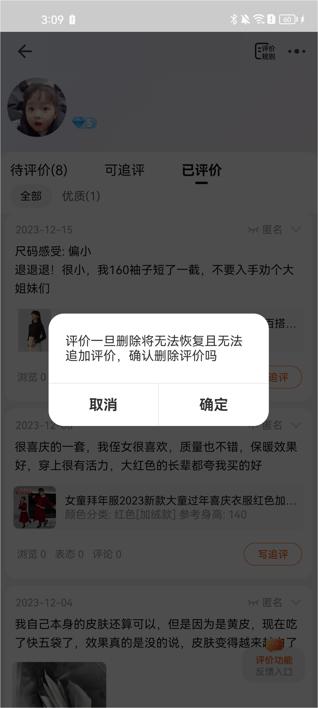 4、最后,如下,在弹窗里点击【确定】即可删除自己的评价内容