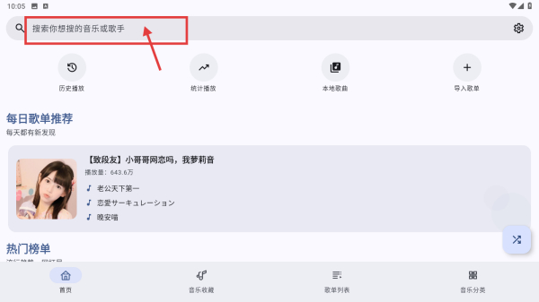 1、打开音乐应用,点击顶部搜索框,进入搜索栏目。