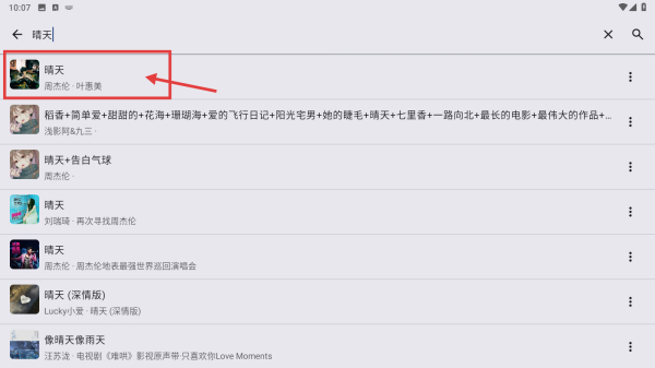 2、在搜索结果中,找到周杰伦演唱的晴天条目,点击搜索。