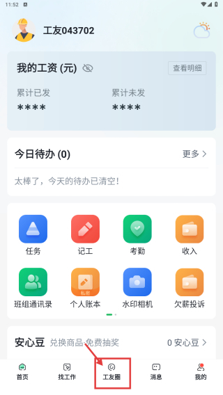 1、打开工友社交APP,点击底部工友圈选项,进入工友社交圈页面。
