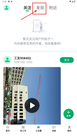 2、在工友圈页面,点击发现标签,查看推荐的工友动态内容。