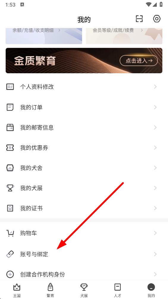 2、在个人中心页面,找到并点击账号与绑定选项,进入账号相关操作页面。