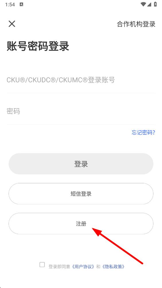 3、在账号相关操作页面,点击注册按钮,进入手机号登录注册页面。