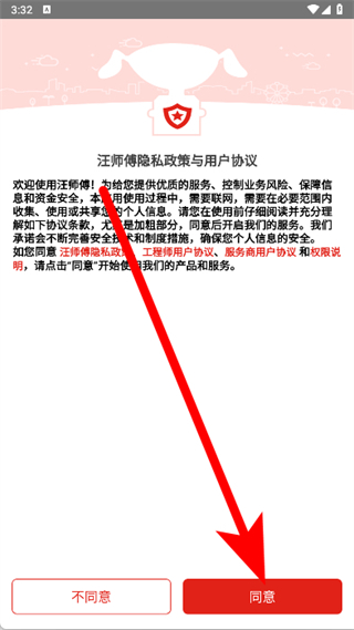 1、打开汪师傅,在隐私政策与用户协议弹窗中,点击同意。