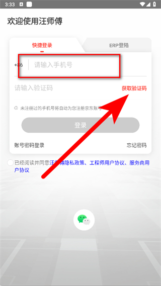 3、在快速登录页面,输入手机号后,点击获取验证码。