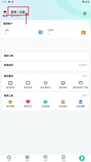 2、在个人中心,点击登录/注册区域,进入登录方式选择页面。