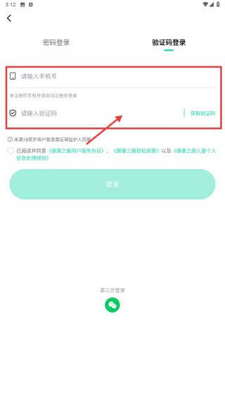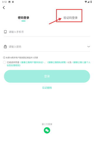 3、在登录方式选择页面,点击验证码登录选项,进入手机号登录界面。