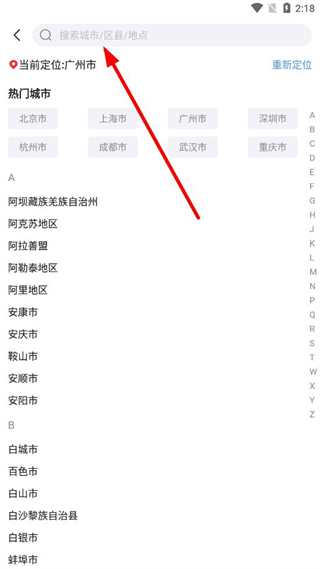 2、进入城市选择页面后,在搜索栏输入要修改的城市名称。