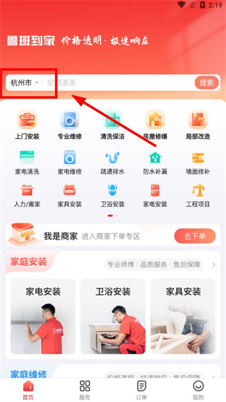1、打开鲁班到家app,在首页点击当前城市的区域位置。