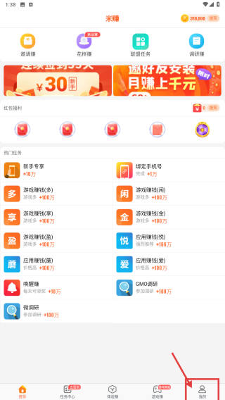 1、打开米赚APP,点击底部我的选项,进入个人中心页面。